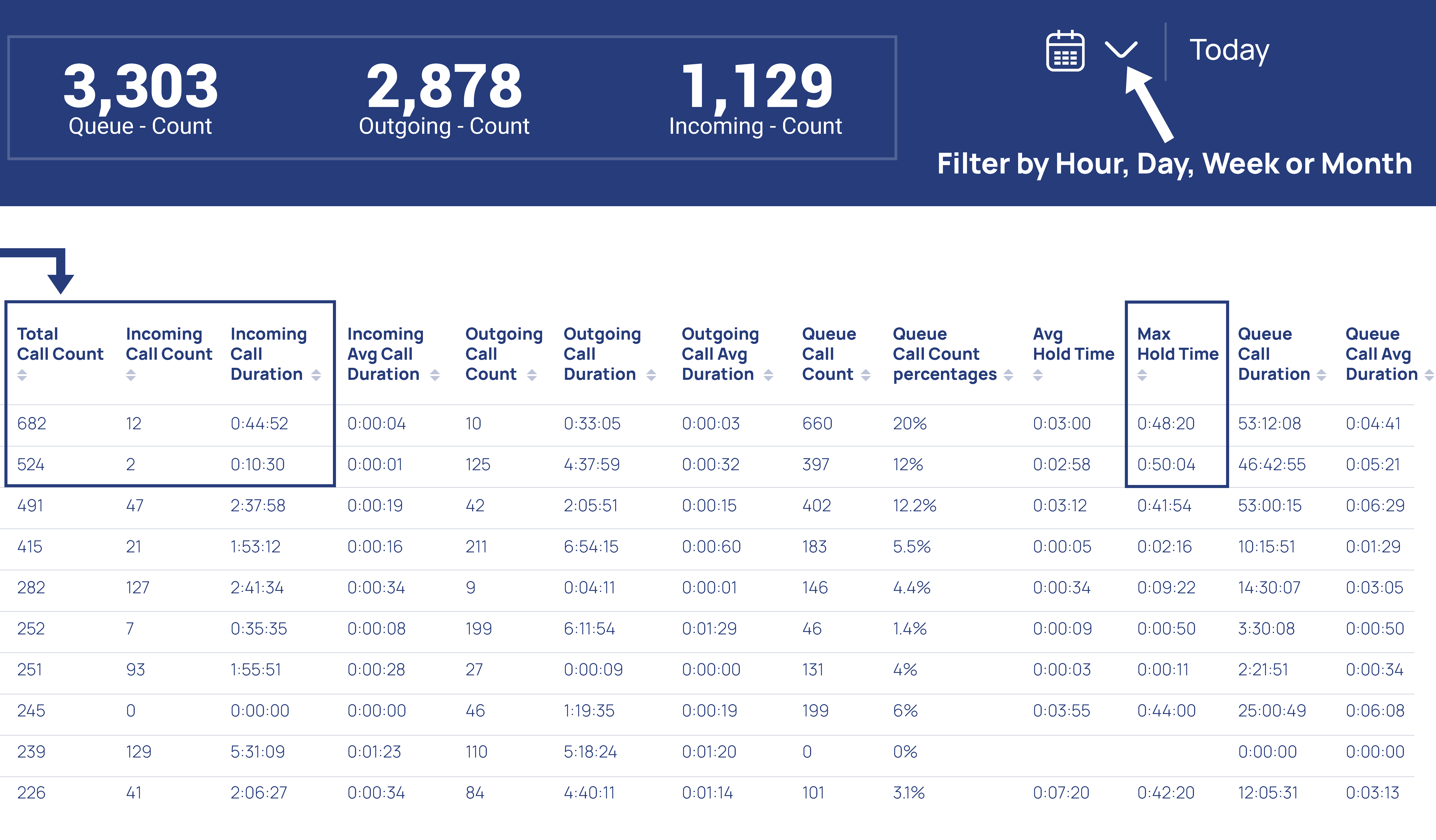 Filter per department as well as per answered or unanswered call. Or any other type of call disposition.